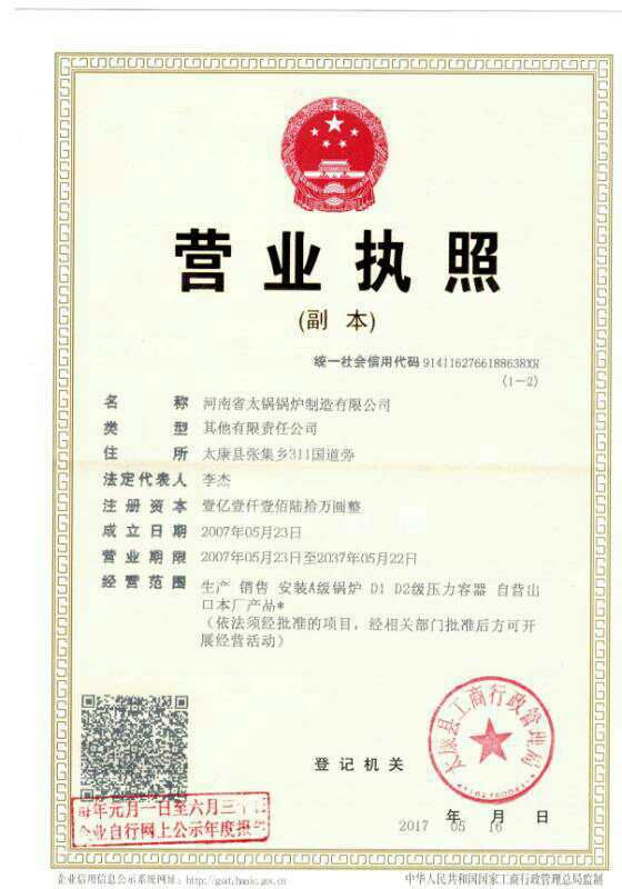 A級鍋爐制造許可證